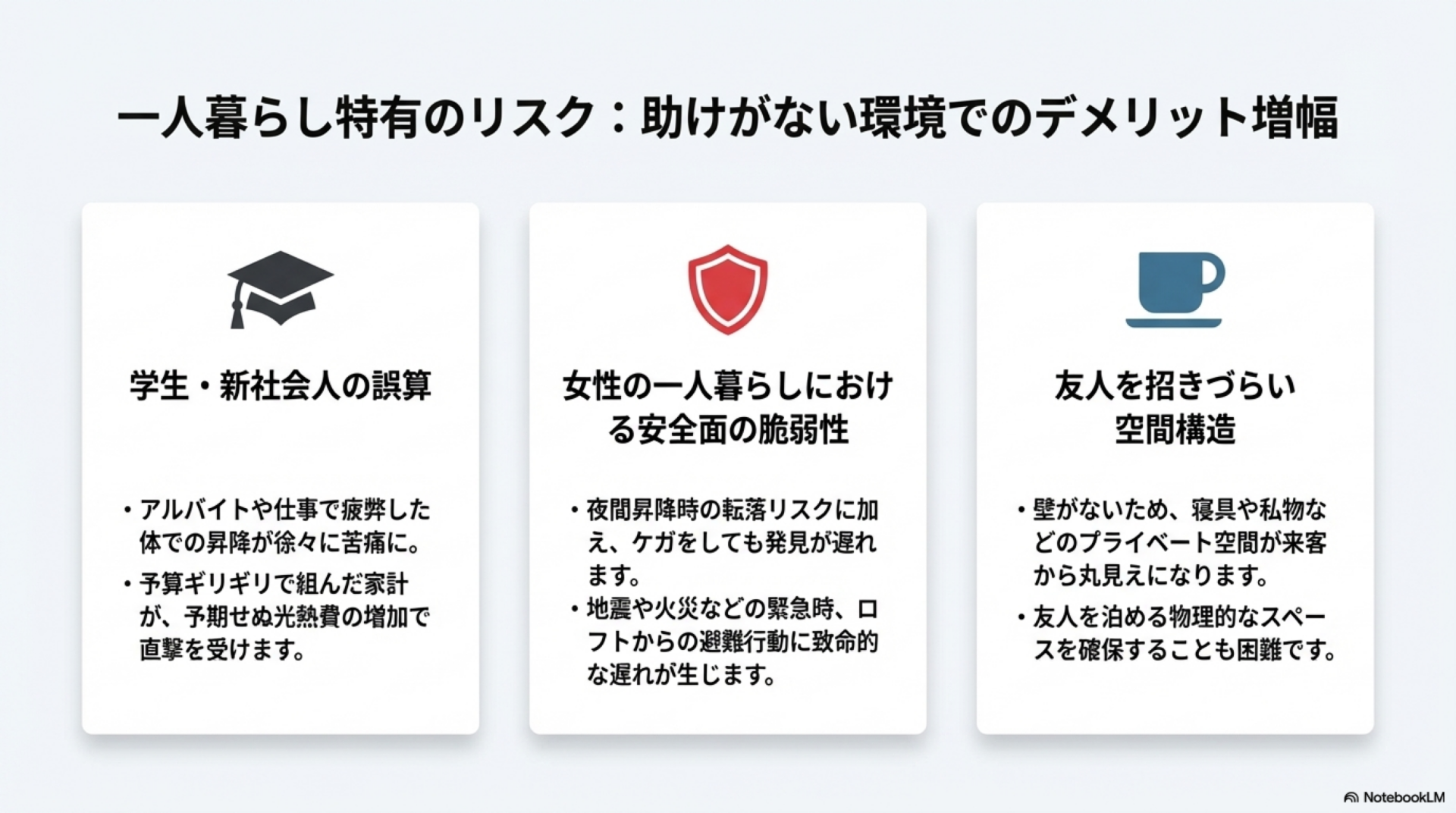 一人暮らしにおいてロフト付き物件が特に不向きとされるのは、単身生活特有の事情がデメリットを深刻化させるためです。困った時に助けてくれる人がいないという一人暮らしの前提が、ロフトのリスクをさらに高めます。