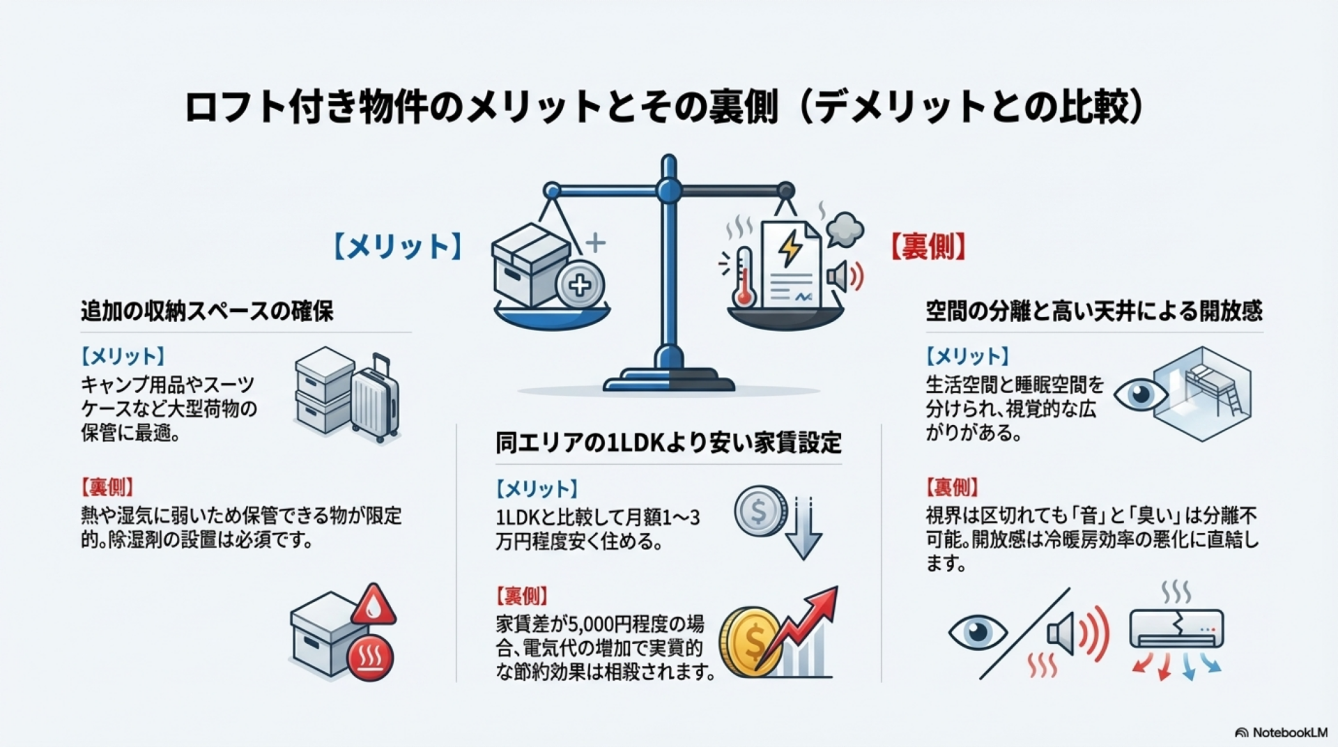 ロフト付き物件にはデメリットが多いのが現実ですが、適切に活用すれば得られるメリットもあります。ただし、前述のデメリットを上回るかどうかは個人のライフスタイル次第です。