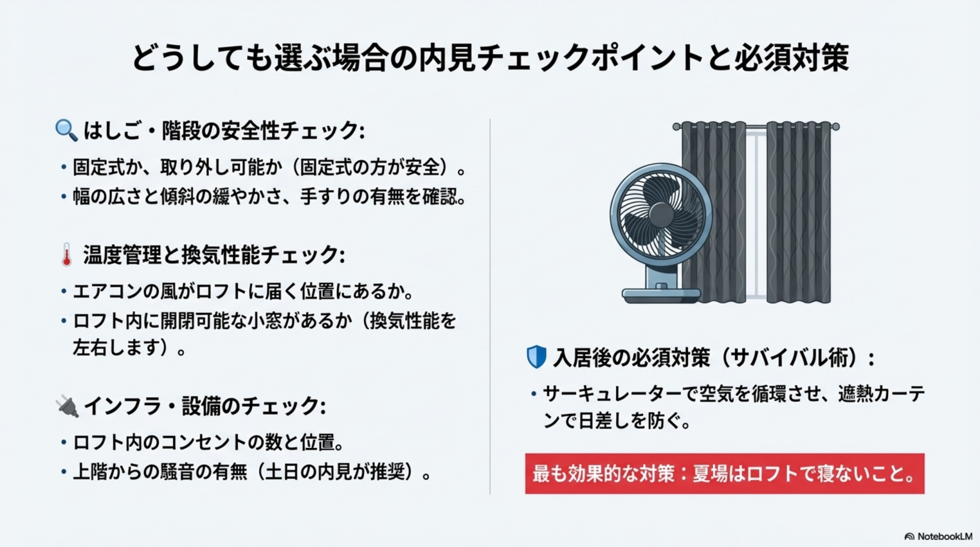 ロフト付き物件の最大の問題は温度管理です。暖かい空気は上昇するという物理法則により、ロフトは必然的に室内で最も暑くなる場所になります。