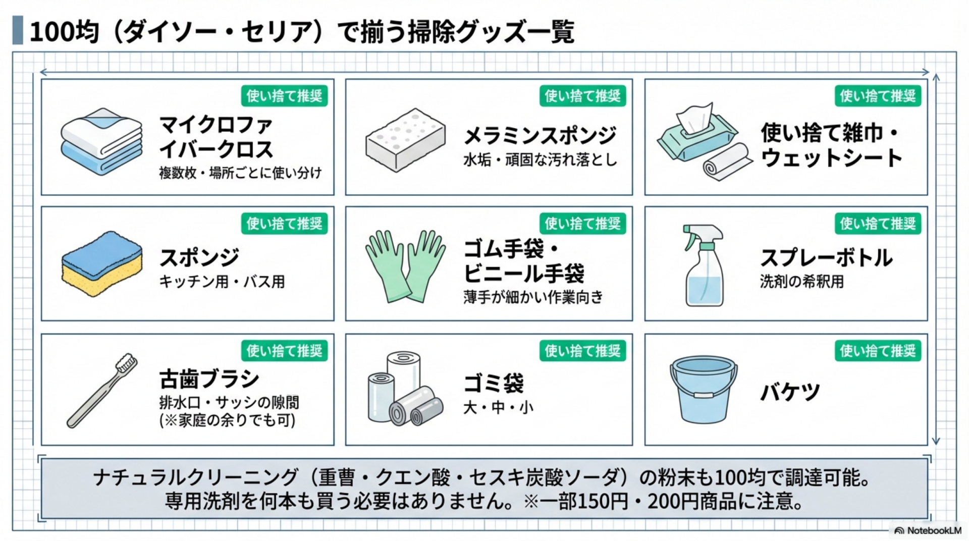 ダイソーとセリアで品揃えに多少の違いがあります。重曹・クエン酸・セスキ炭酸ソーダといったナチュラルクリーニング系の粉末も100均で購入できるため、専用洗剤を何本も買う必要はありません。
