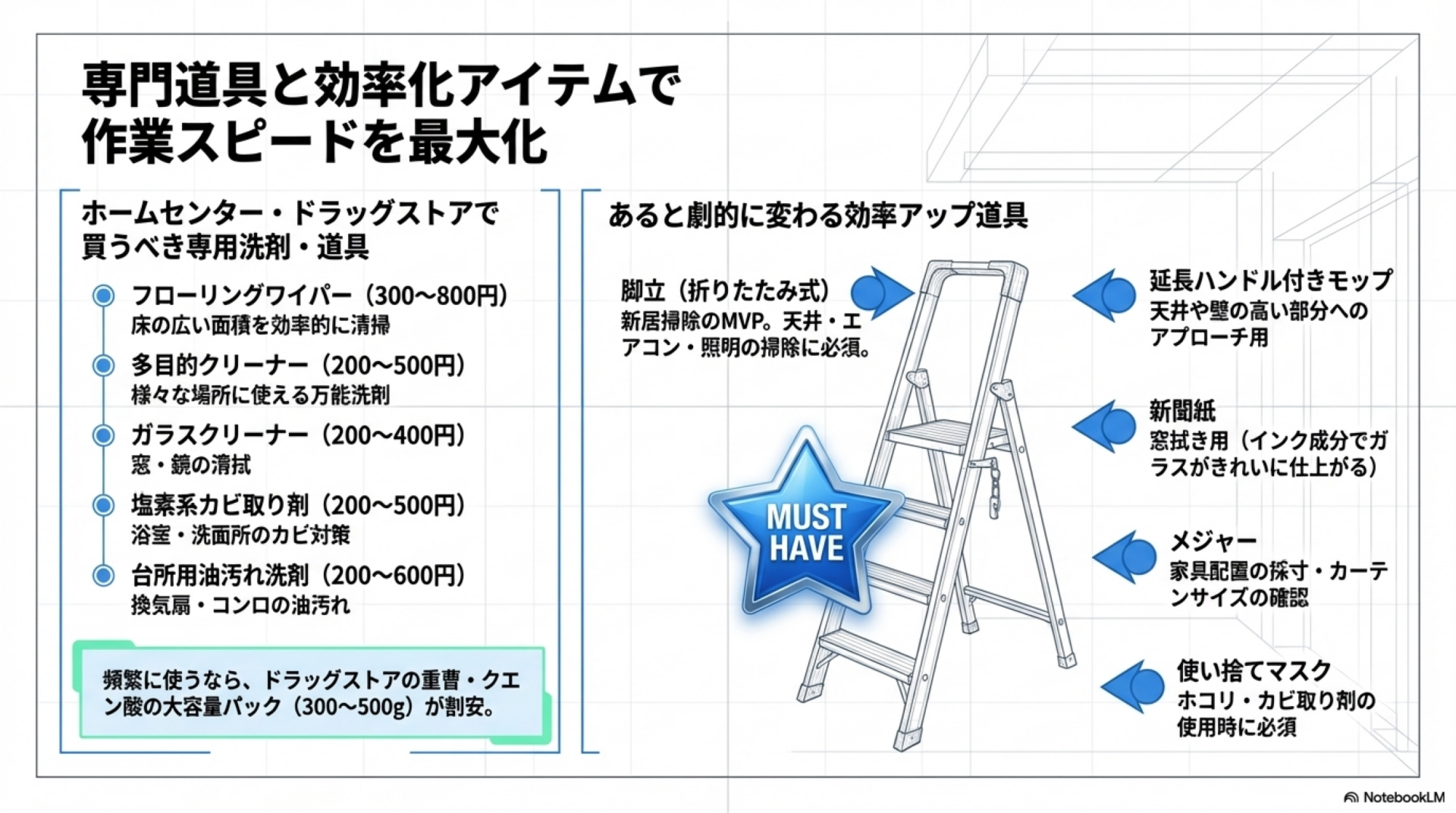 特に脚立は新居掃除で最も活躍するアイテムです。天井近くの埃払い、エアコンフィルター掃除、照明器具の確認など用途が広く、引越し後の収納にも困らない折りたたみタイプを選ぶと便利です。
