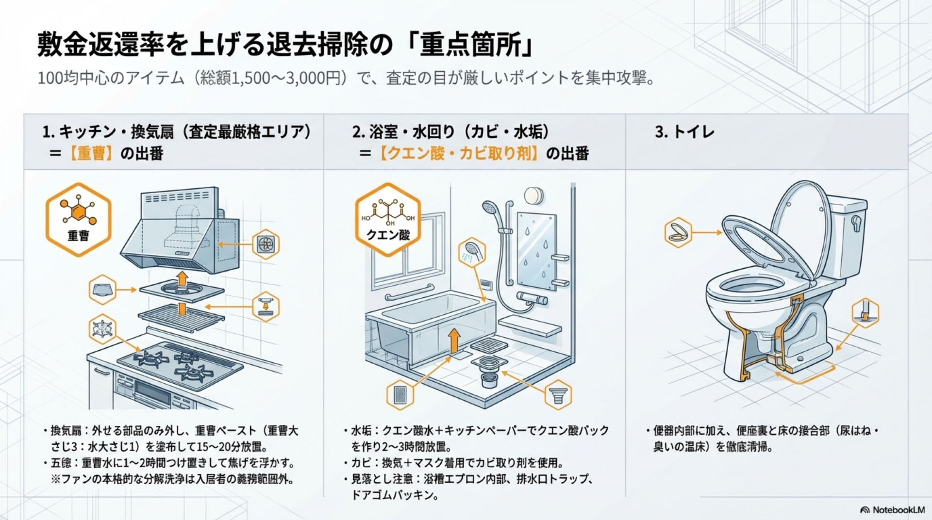 - トイレ:便座裏と床の接合部は見落としやすい。便器内の水垢にはクエン酸系洗剤が有効
