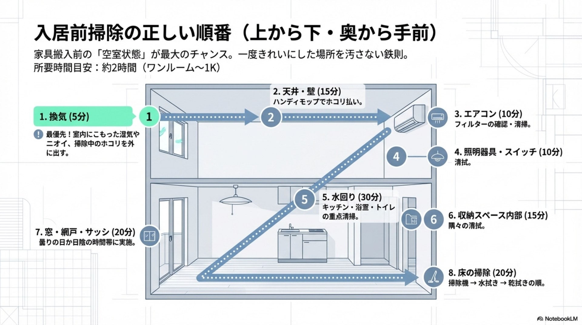 掃除は**「上から下へ」「奥から手前へ」**が鉄則です。この順番を守ることで、一度きれいにした場所を汚さずに進められます。