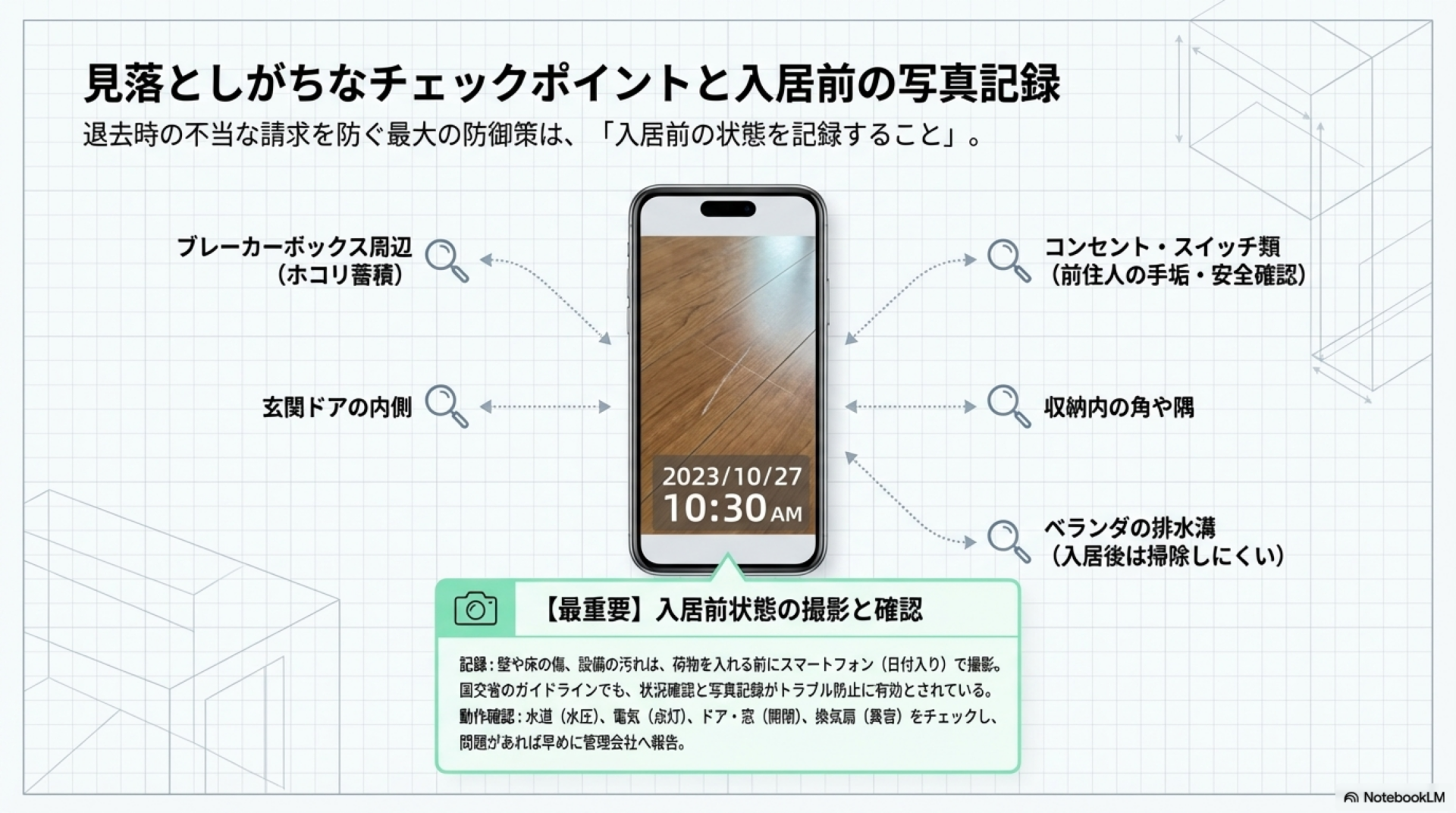 国土交通省の原状回復ガイドラインでも、入退去時の物件状況の確認と写真記録がトラブル防止に有効であると記載されています。