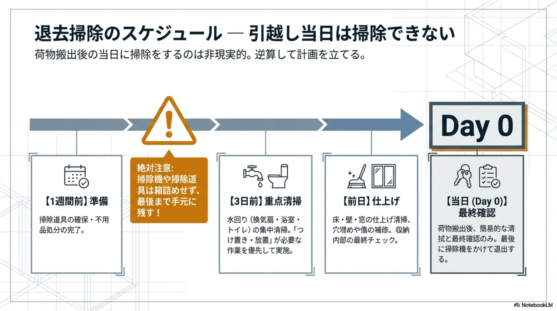 - 1週間前:掃除道具の確保と不用品処分の完了。掃除道具は荷造りせず手元に残す
