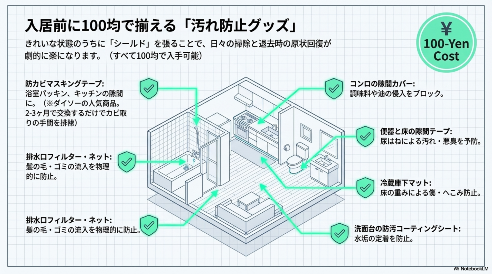 入居前のきれいな状態のうちに汚れ防止グッズを設置しておくと、日々の掃除がぐっと楽になり、退去時の原状回復にも効果的です。すべて100均で購入できます。