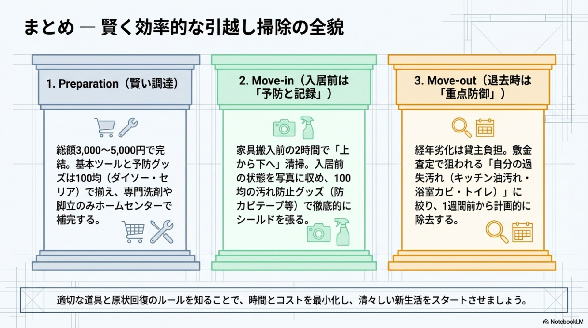 総額3,000〜5,000円程度で引越し掃除の道具は十分に揃います。事前準備と適切な道具選びさえ押さえれば、誰でもコストを抑えながら効率的に掃除できます。