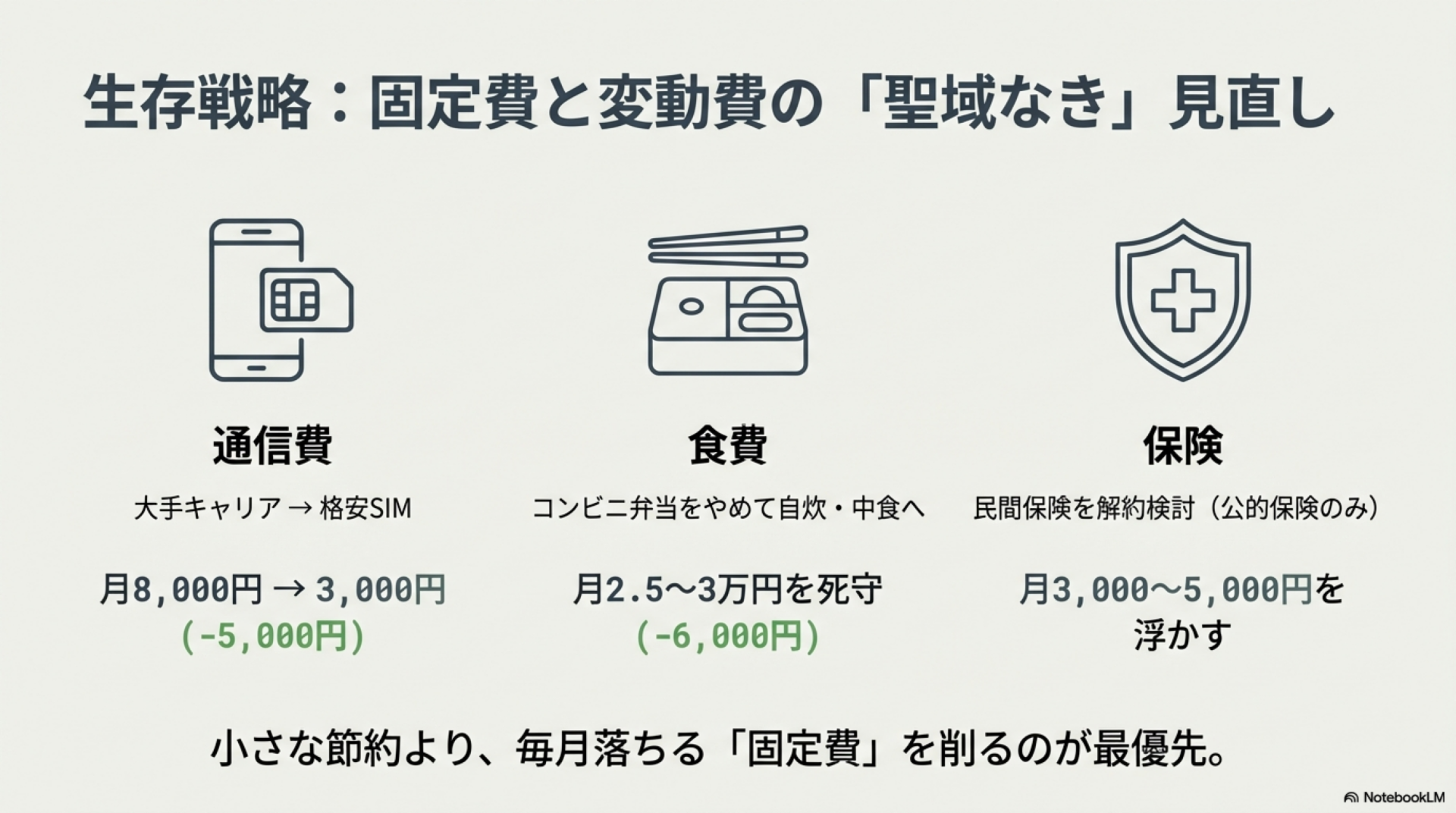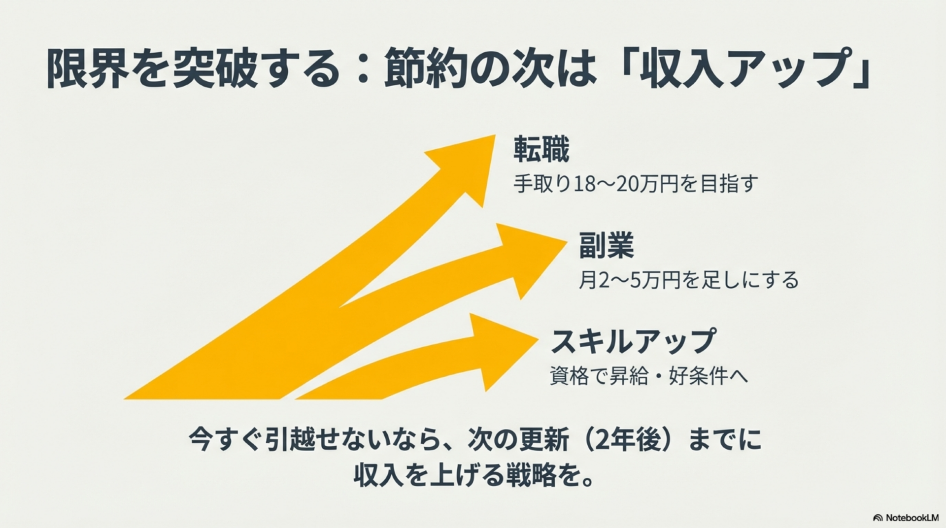 - 収入増加の方向も同時に考える:副業や転職の検討