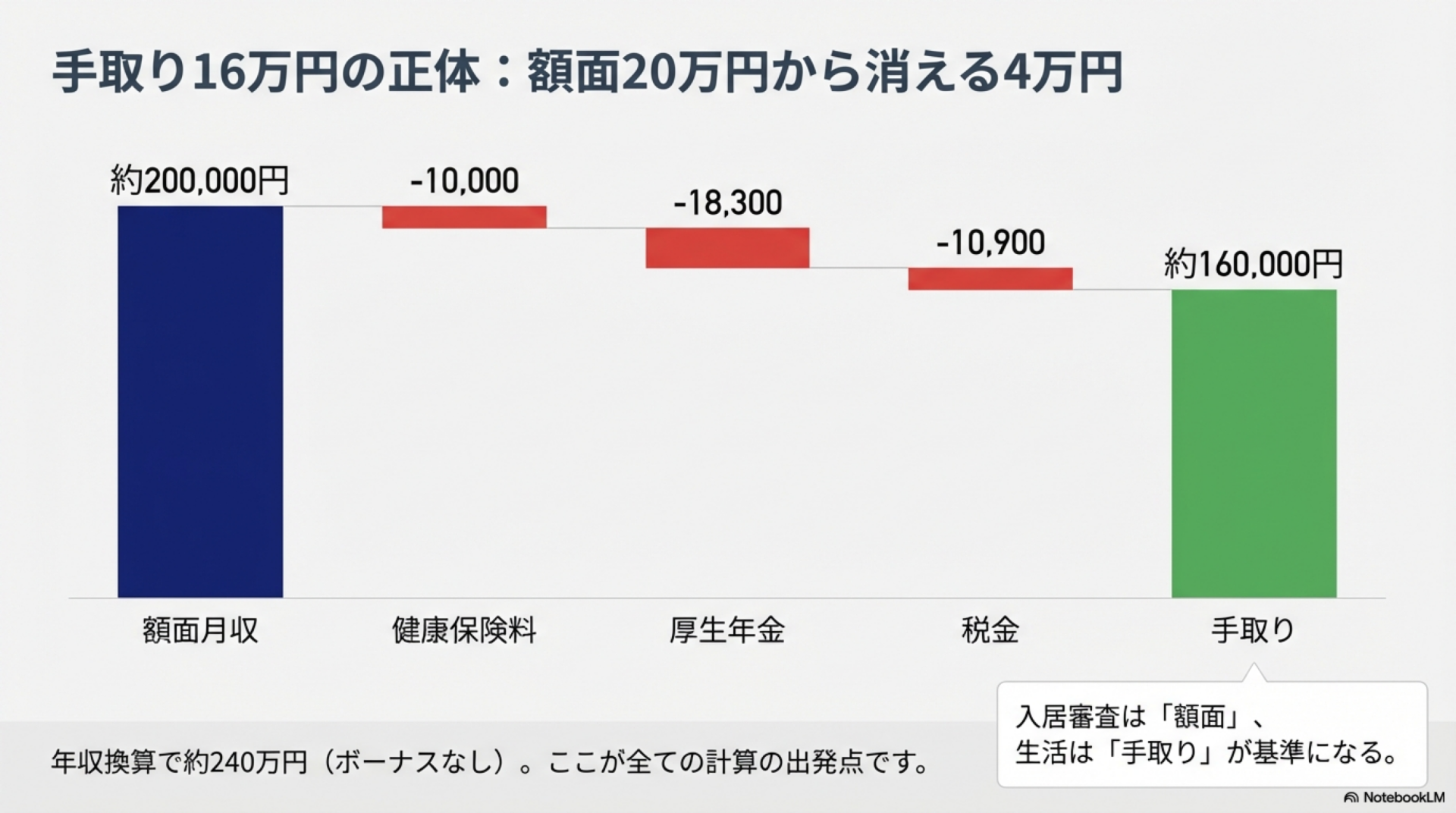 手取り16万円というのは、一般的に額面給与が20万円程度の場合に想定される金額です。まずは、なぜ額面から手取りまでにこれだけの差が生じるのか、詳しく見ていきましょう。