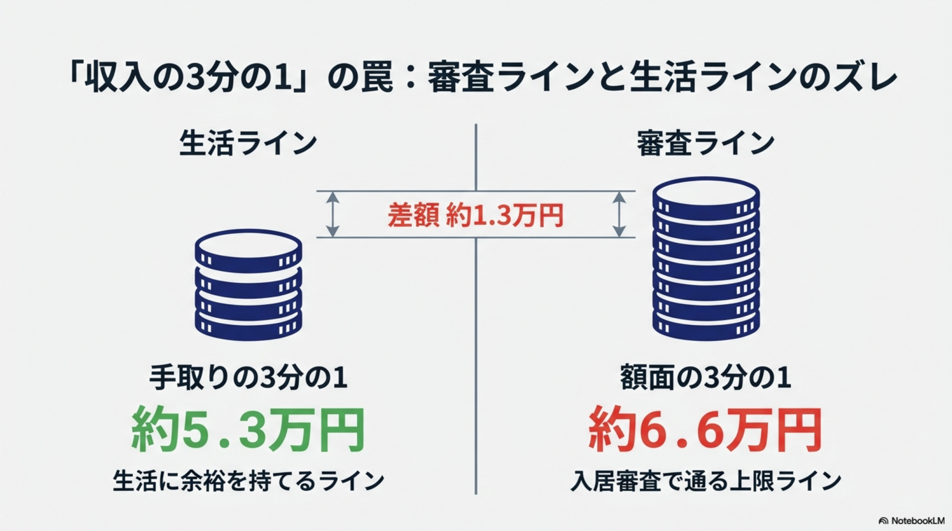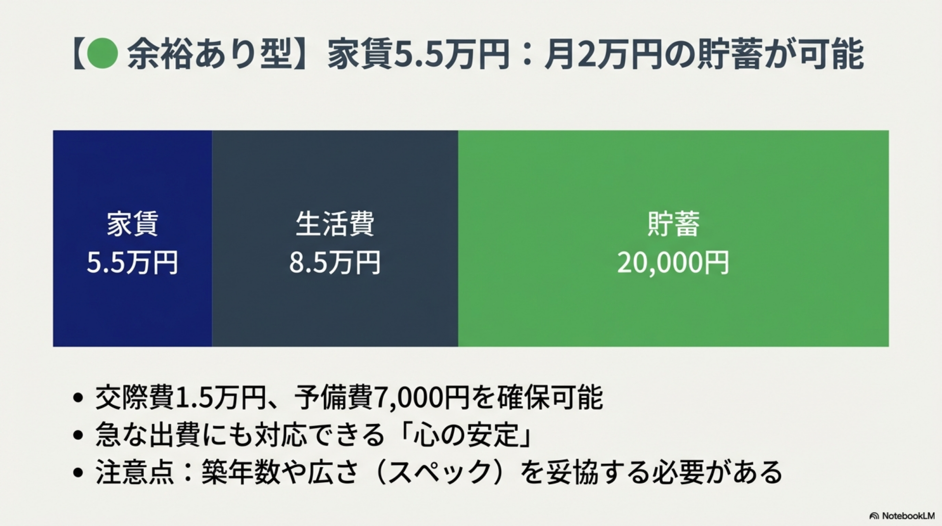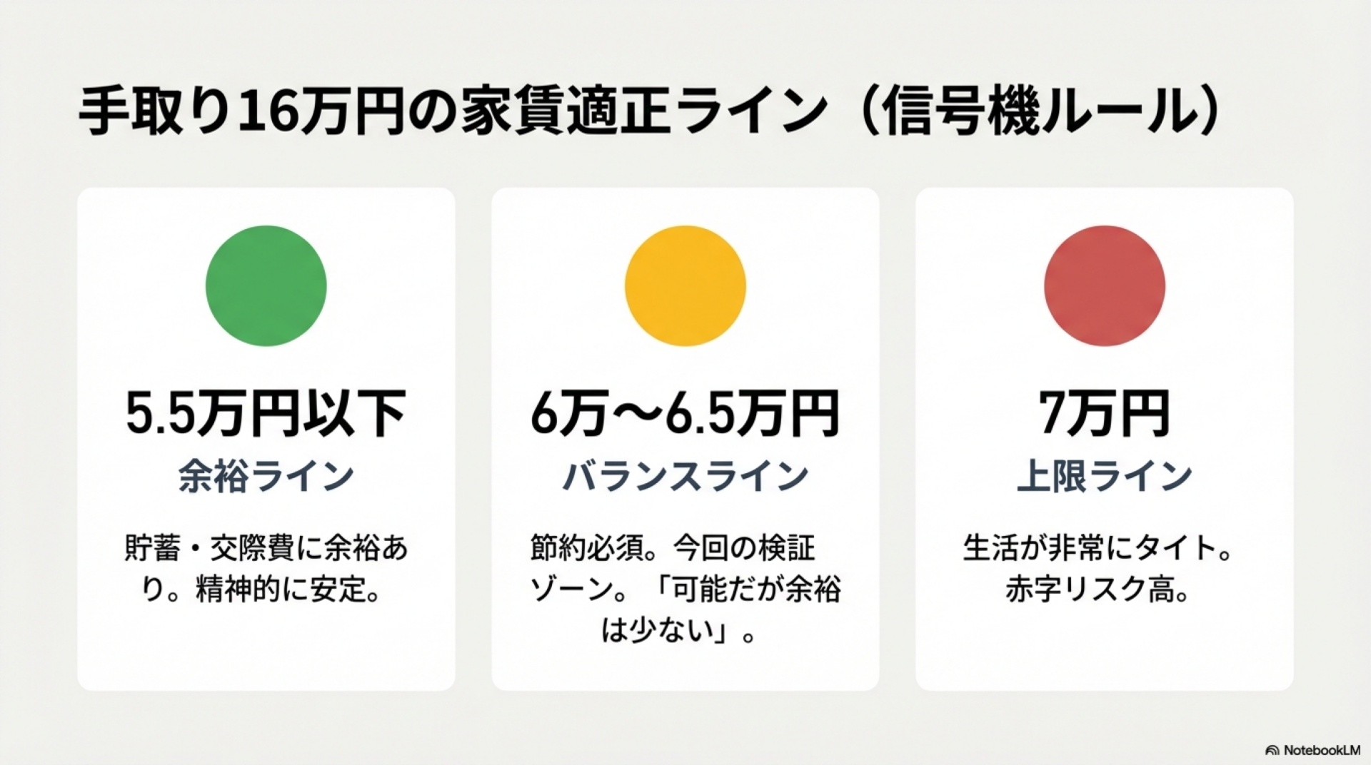 - 都市部での現実的な範囲:5.5~6.5万円(収入の34~41%)