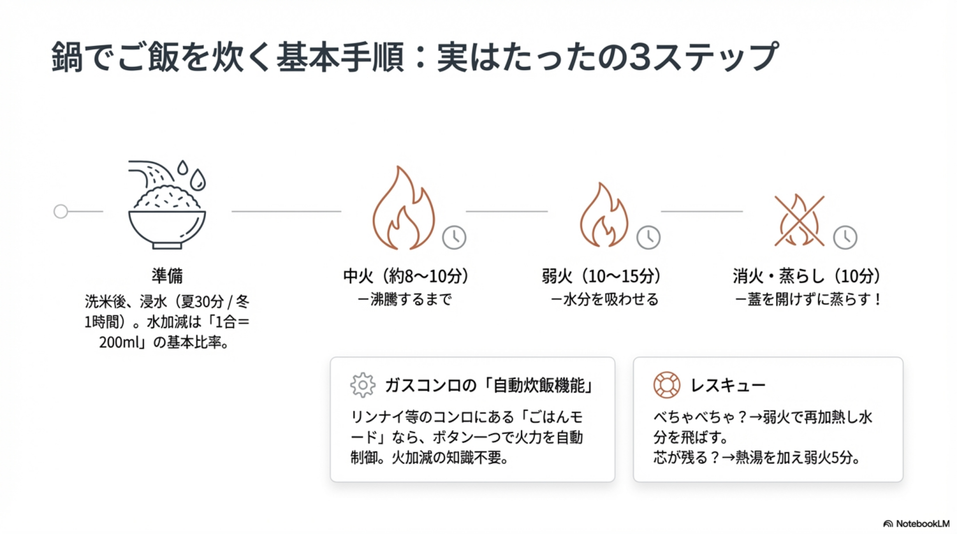 鍋炊飯は**「中火→弱火→消火(蒸らし)」の3段階**で進めます。