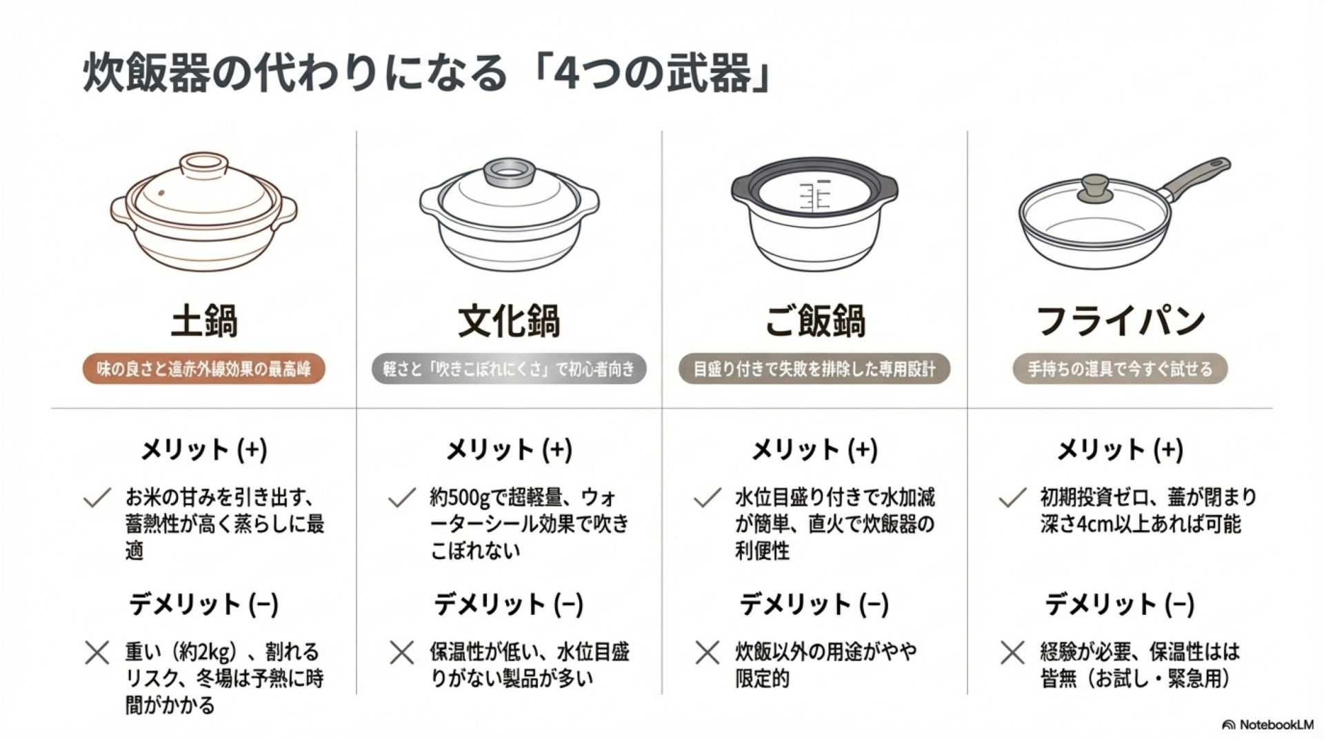 炊飯器を使わずにご飯を炊く場合、土鍋・文化鍋・ご飯鍋・フライパンの4つの選択肢があります。それぞれの特徴を理解して、自分の生活スタイルに最適な道具を選びましょう。