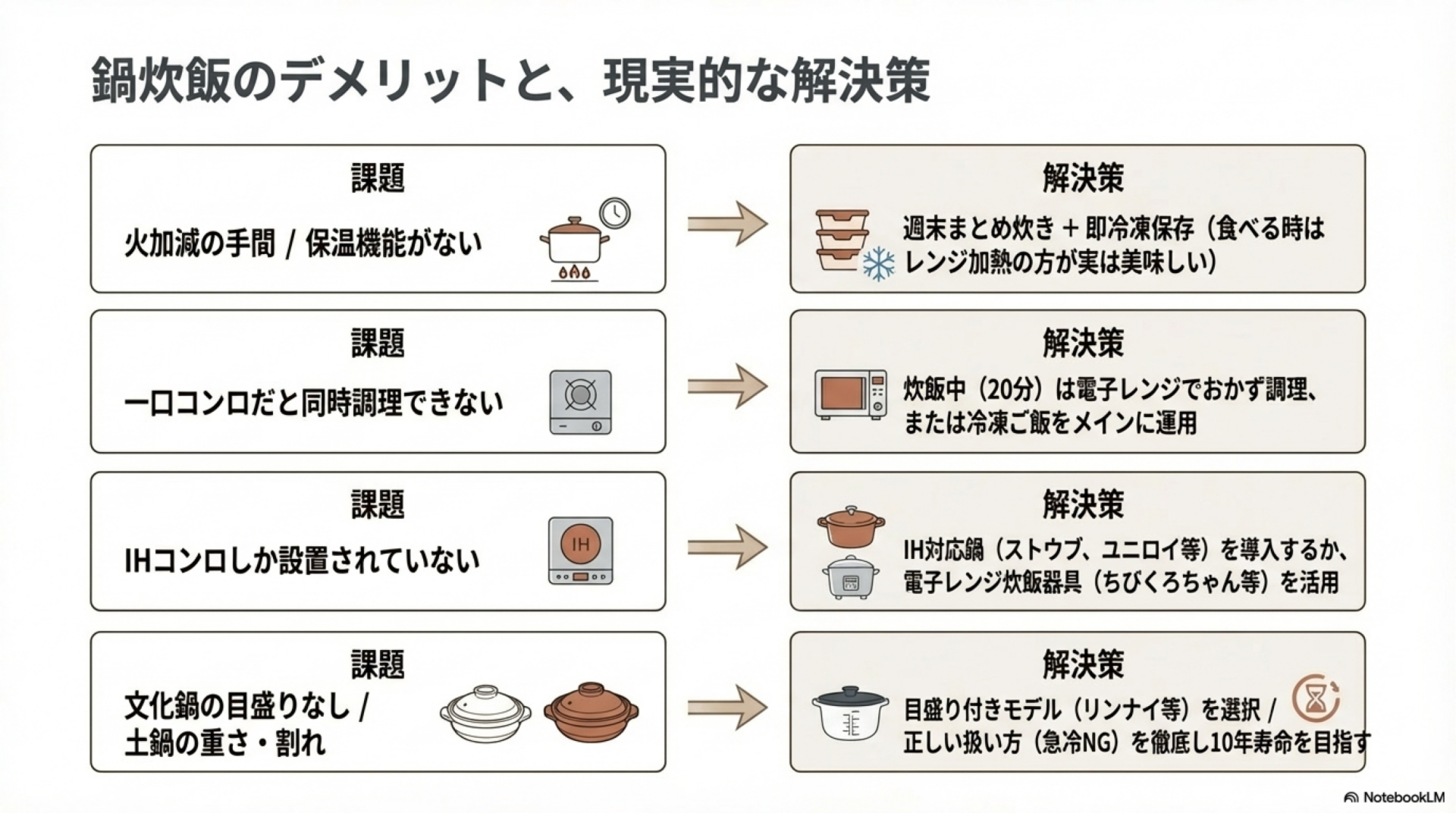 炊飯器なし生活が向いている方は、キッチンが狭い・初期費用を抑えたい・味にこだわりたい・週2〜3回のまとめ炊きで十分という方です。炊飯器を選ぶべき方は、毎朝タイマー炊飯が必要・調理に手間をかけたくない・一口コンロで同時調理したいという方です。