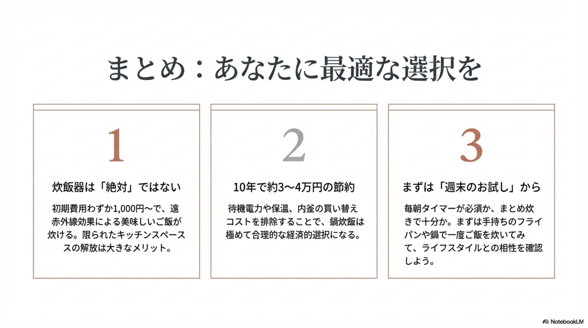 一方で、光熱費だけの比較では保温なしの炊飯器が最も安く、タイマー予約や保温機能の便利さは鍋では代替できません。自分のライフスタイルに合った選択が最も重要です。
