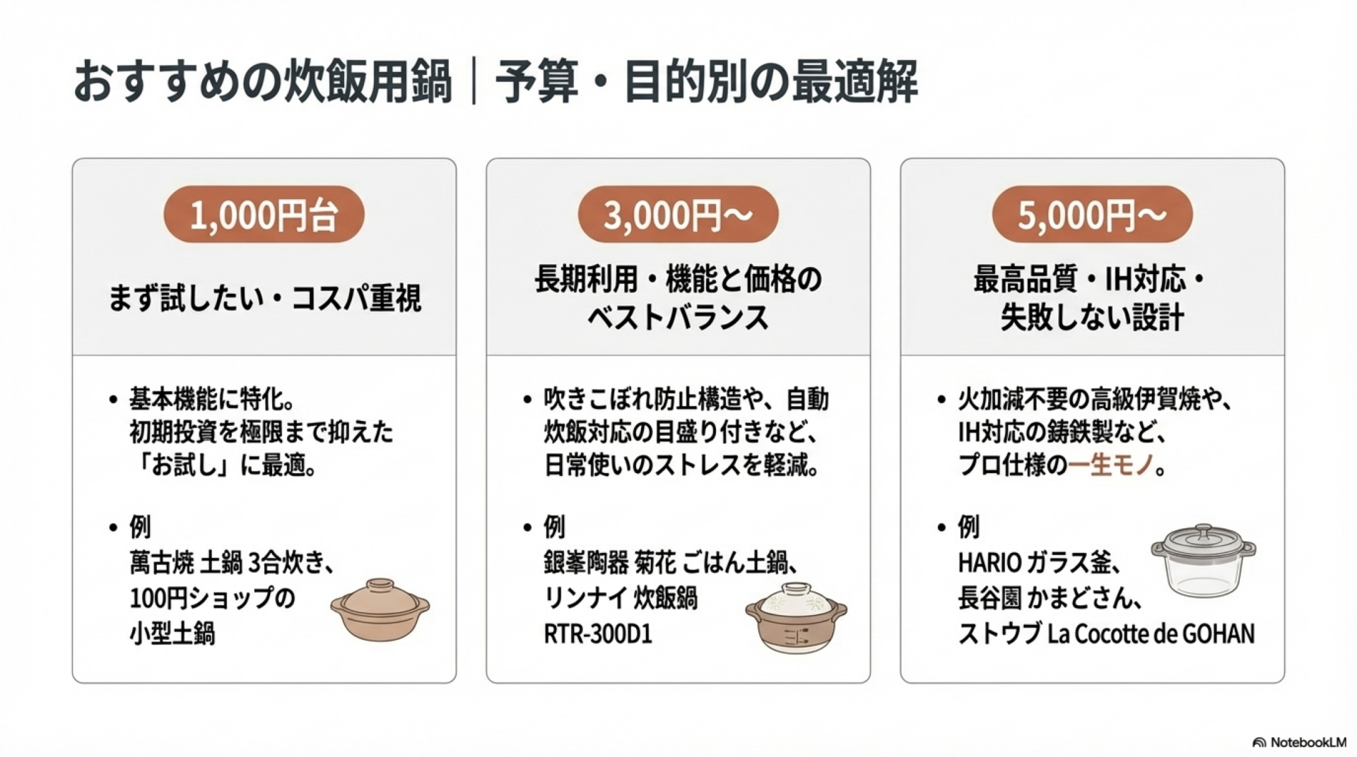 | 土鍋 | 1,000円〜10,000円 | 1,000円台でも十分美味しく炊ける |