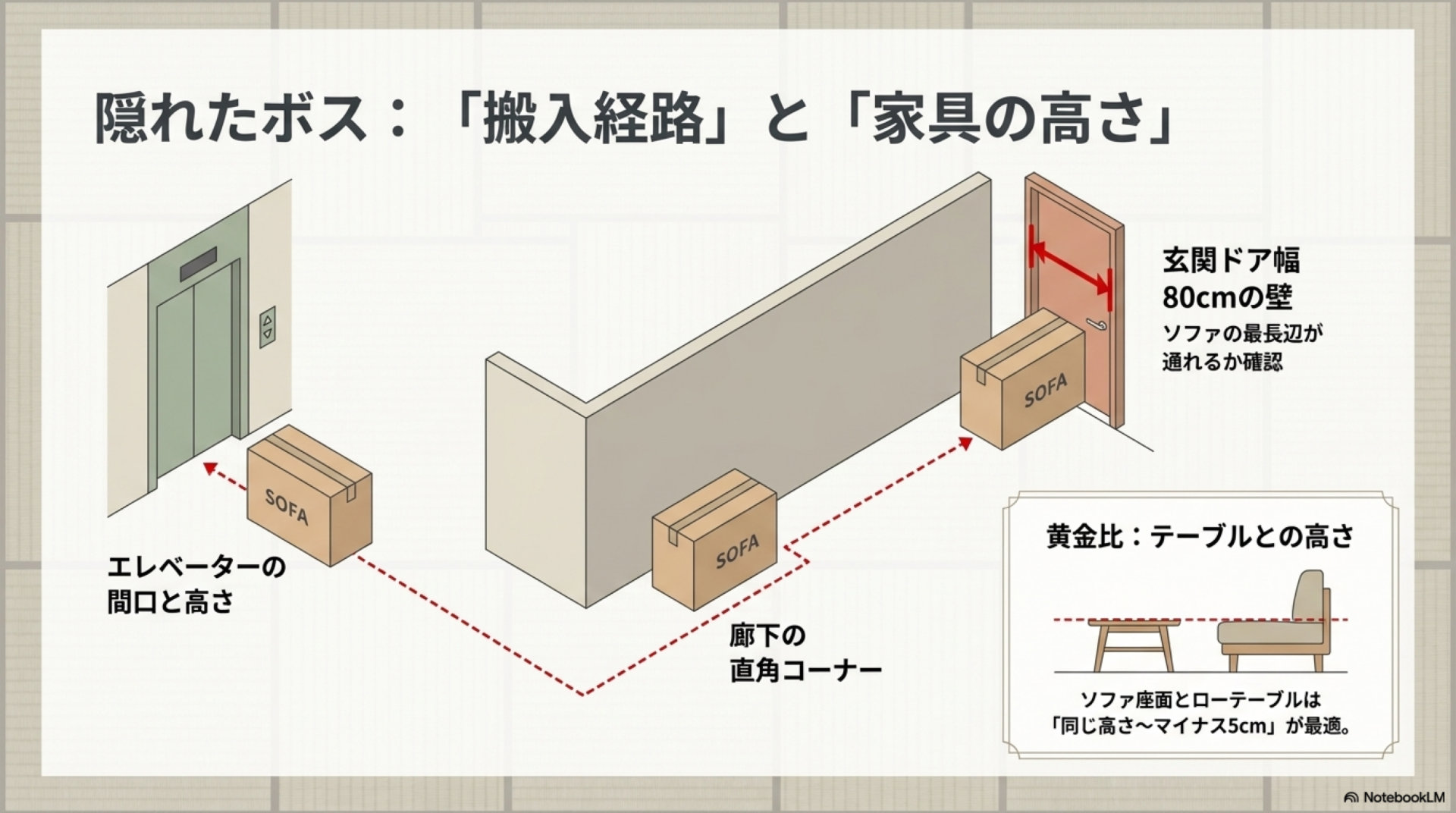 不安がある場合は、分解可能なソファや組み立て式(フラットパック)のモデルを選ぶか、配送業者に事前相談するのが安全です。
