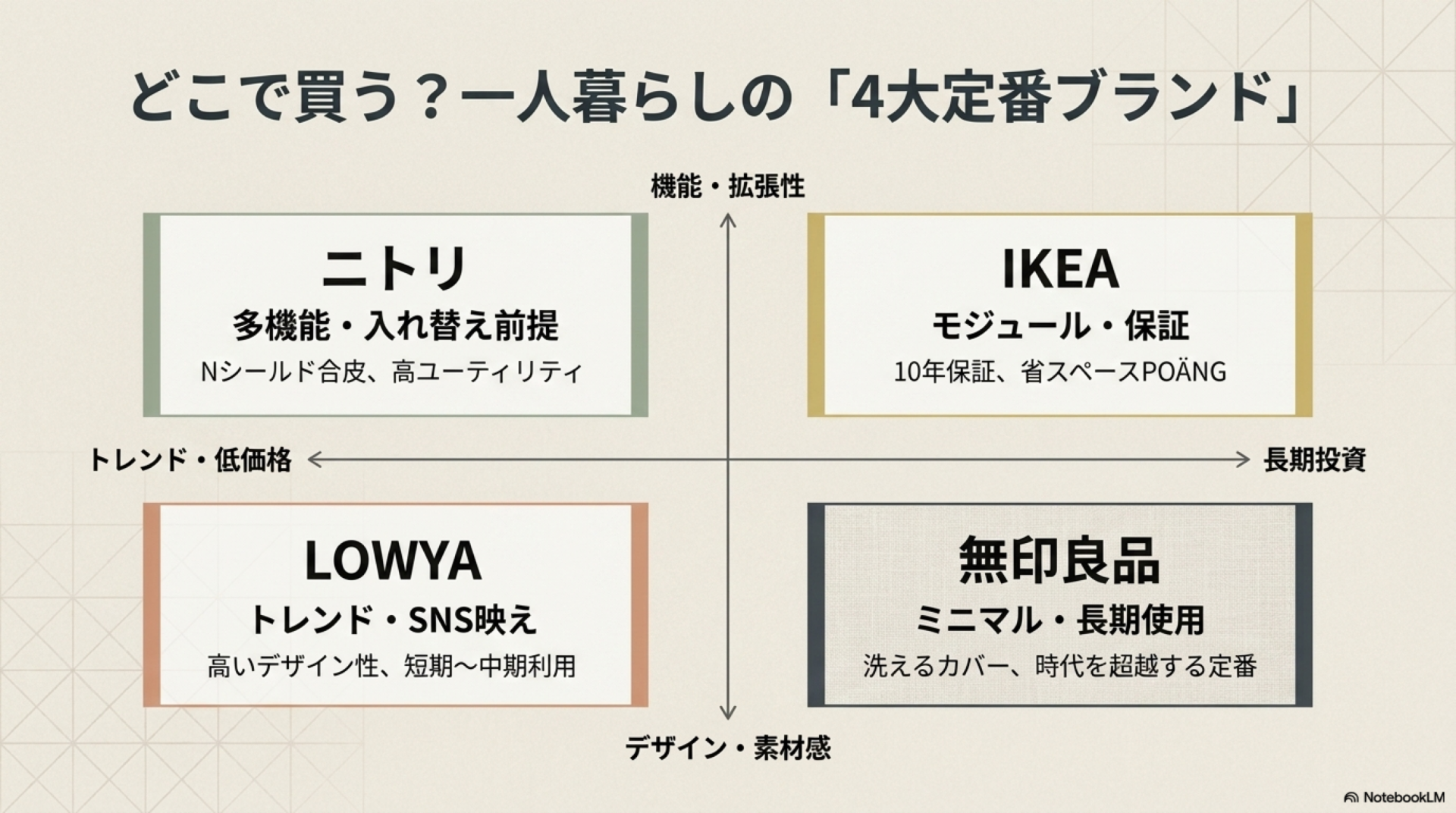一人暮らし向けソファ市場の中心は、ニトリ・LOWYA・無印良品・IKEAの4ブランドです。それぞれの戦略の違いがそのまま製品設計に表れています。
