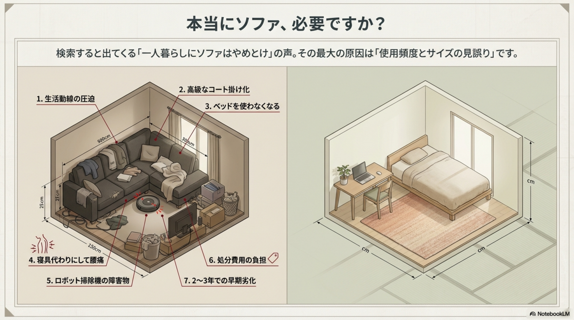 一方で、検索すると「一人暮らしにソファはいらない」「やめとけ」という意見も多く見つかります。実際のところ、ソファは本当に必要なのでしょうか?