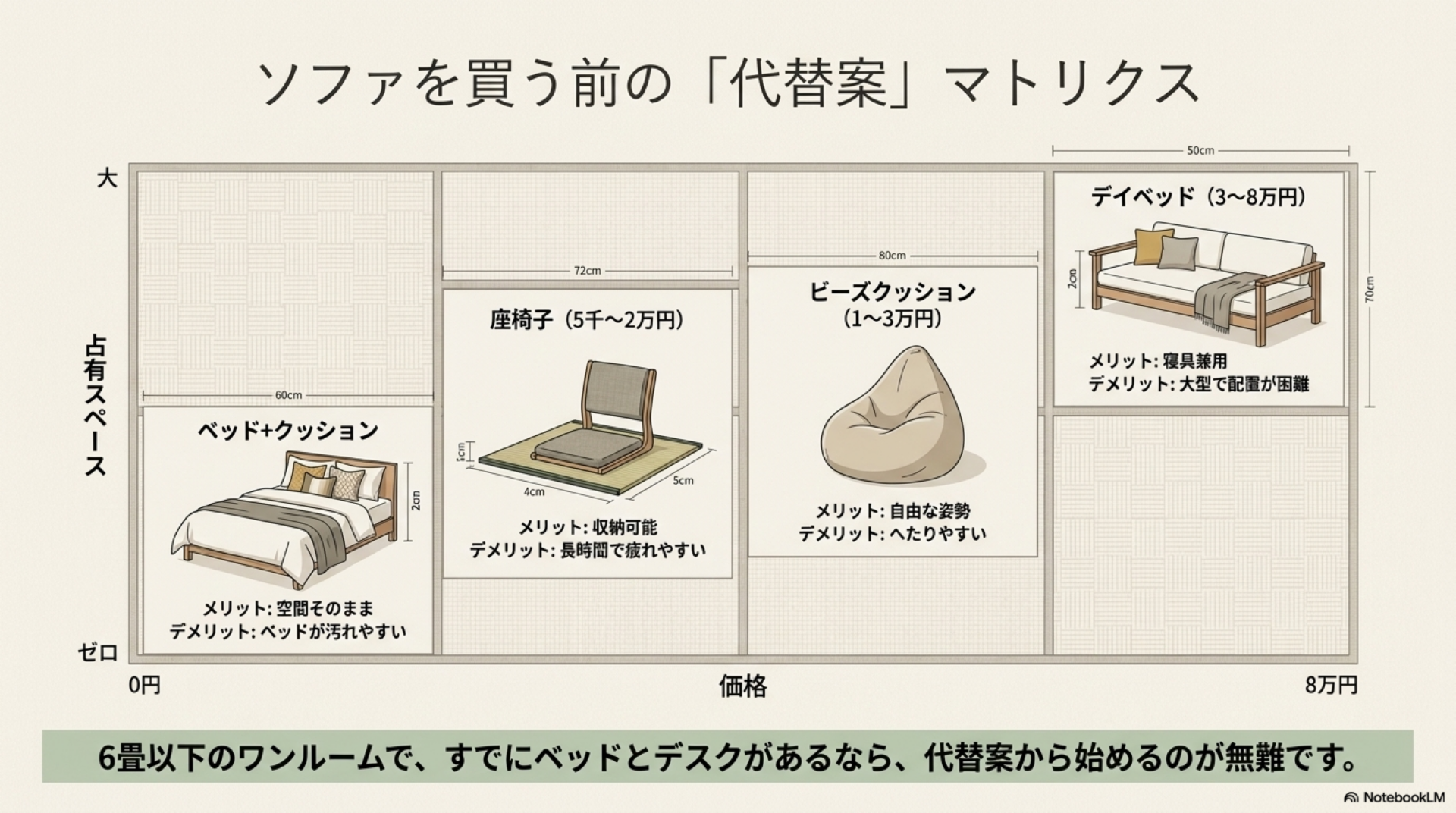 ベッドをソファ代わりに使う方法は、ワンルームの限られたスペースでは現実的な選択肢です。具体的な工夫はベッドをソファ代わりに使う:狭い部屋での快適な生活の実現方法で詳しく解説しています。