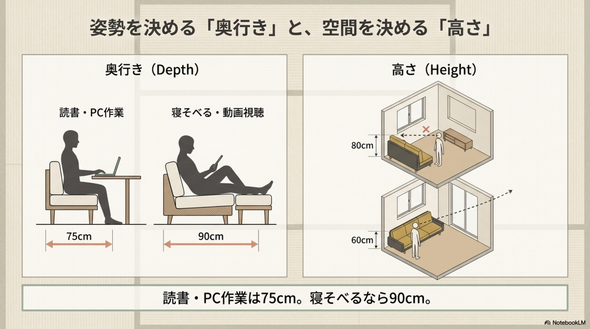 用途で変わる座面の奥行き|読書75cm・寝そべり90cm