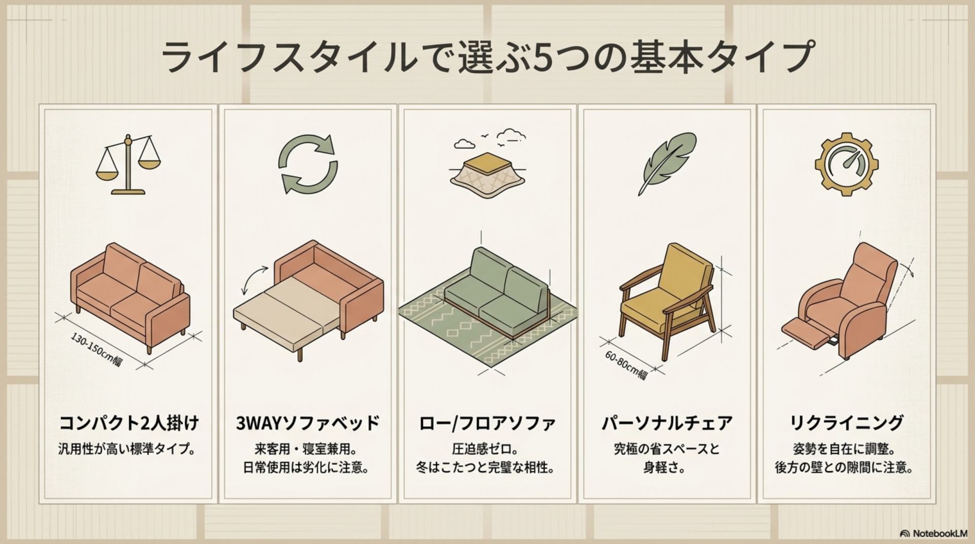 ソファ単体ではなく、ベッド・テーブル・収納を含めた家具一式で揃えたい場合は、一人暮らしの家具セット完全ガイド|選び方からコスパ最強セットまでも参考になります。