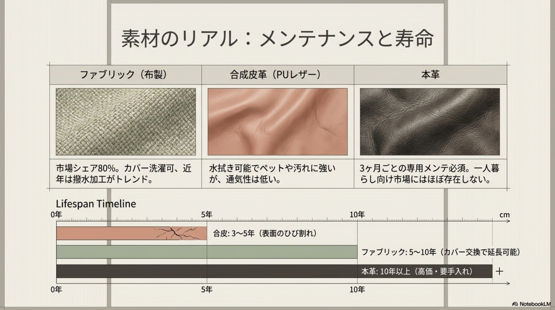 買うと決めたら、部屋の広さに対して幅が床面積の20%以下を目安にサイズを絞り、用途に合うタイプを選びます。素材は短期使用なら合成皮革、長期使用ならファブリック(撥水加工付き)が現実的で、本革は一人暮らしの価格帯では選択肢が限定されます。最後に、搬入経路の採寸と試座を必ず行い、後悔のない一台を選びましょう。