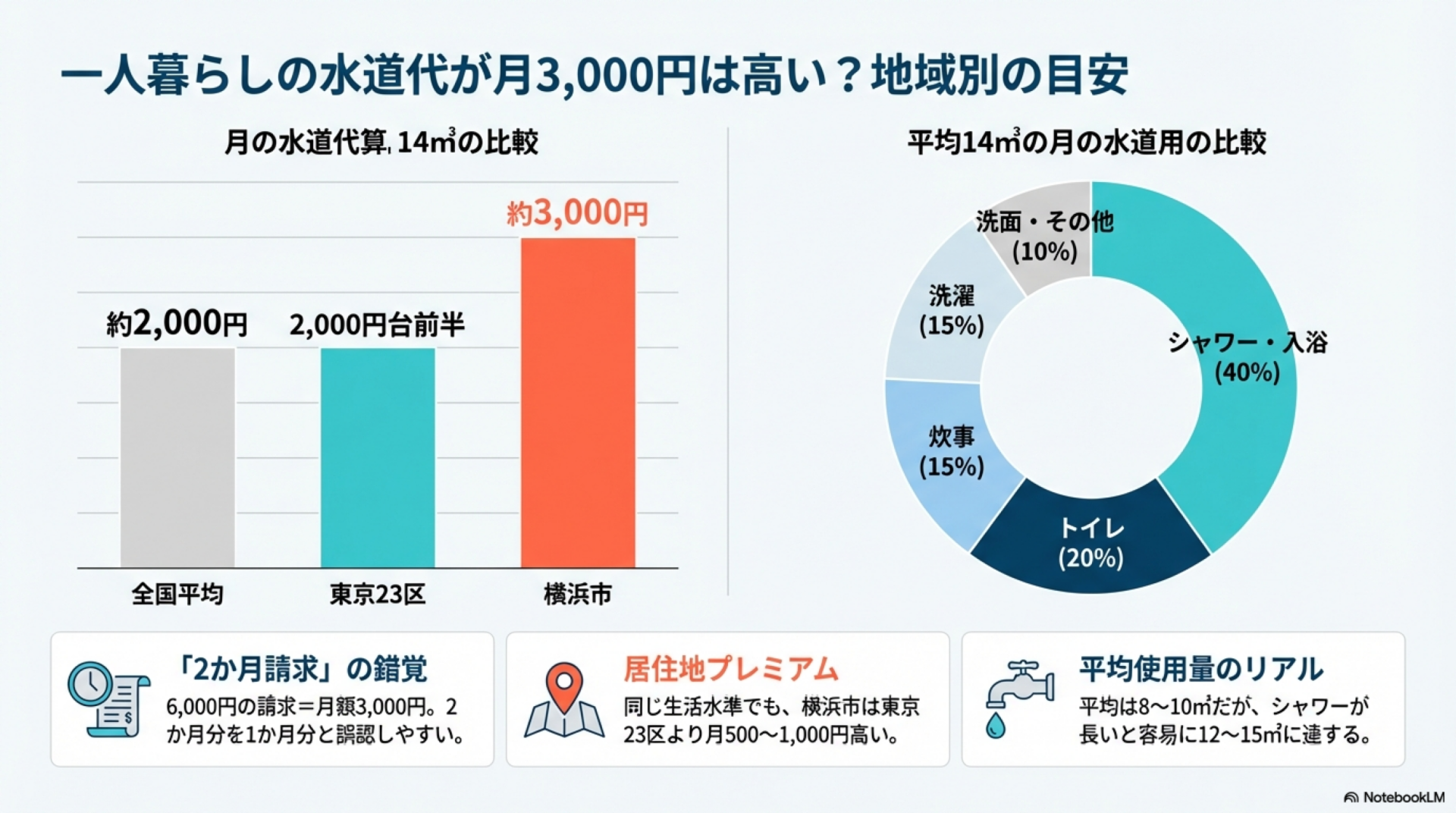 結論からいうと、一人暮らしの水道代が月3,000円は全国的にはやや高めです。ただし、横浜市に住んでいる場合は標準的な金額といえます。