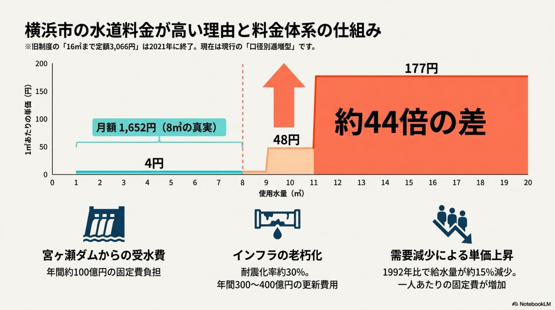 宮ヶ瀬ダムからの年間約100億円の受水費、老朽化した水道管の更新費用、そして需要減少による一人あたり固定費の上昇が主な原因です。加えて、8㎥超から従量料金が急上昇する料金構造により、一般的な使用量の世帯ほど割高に感じやすくなっています。