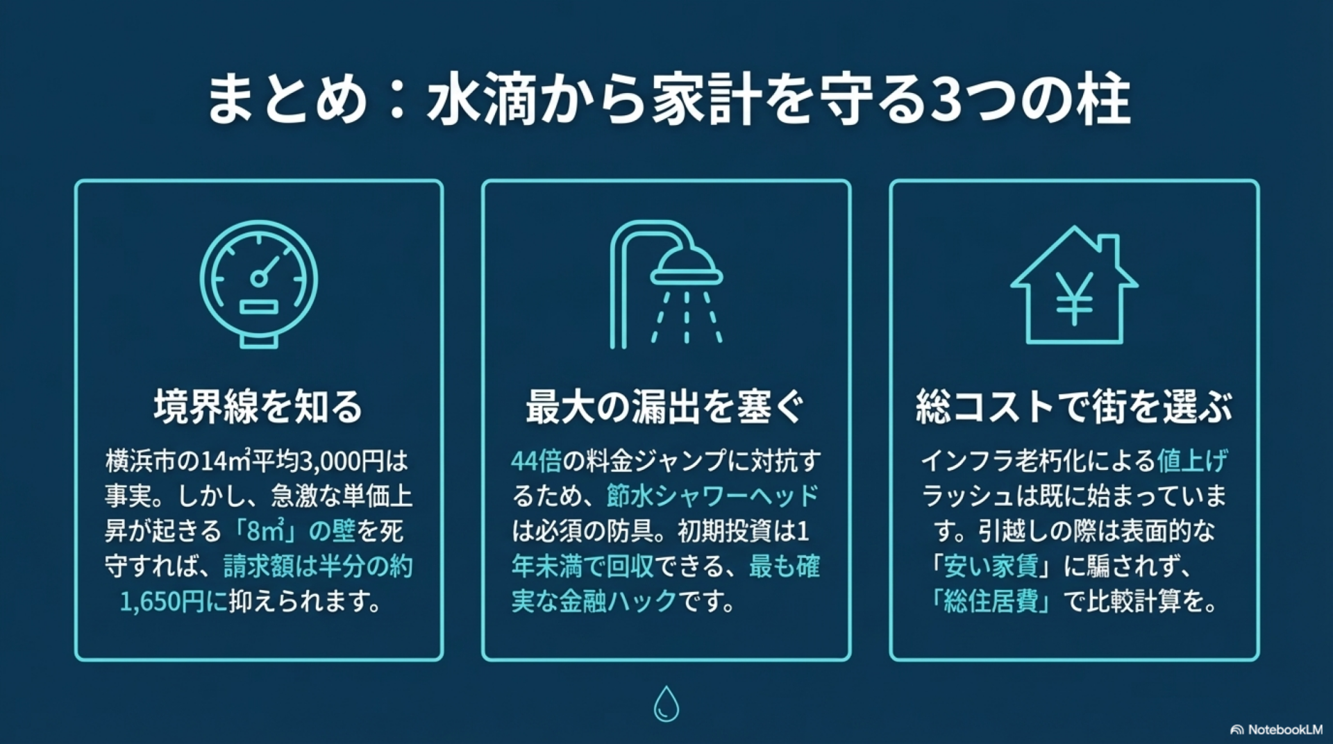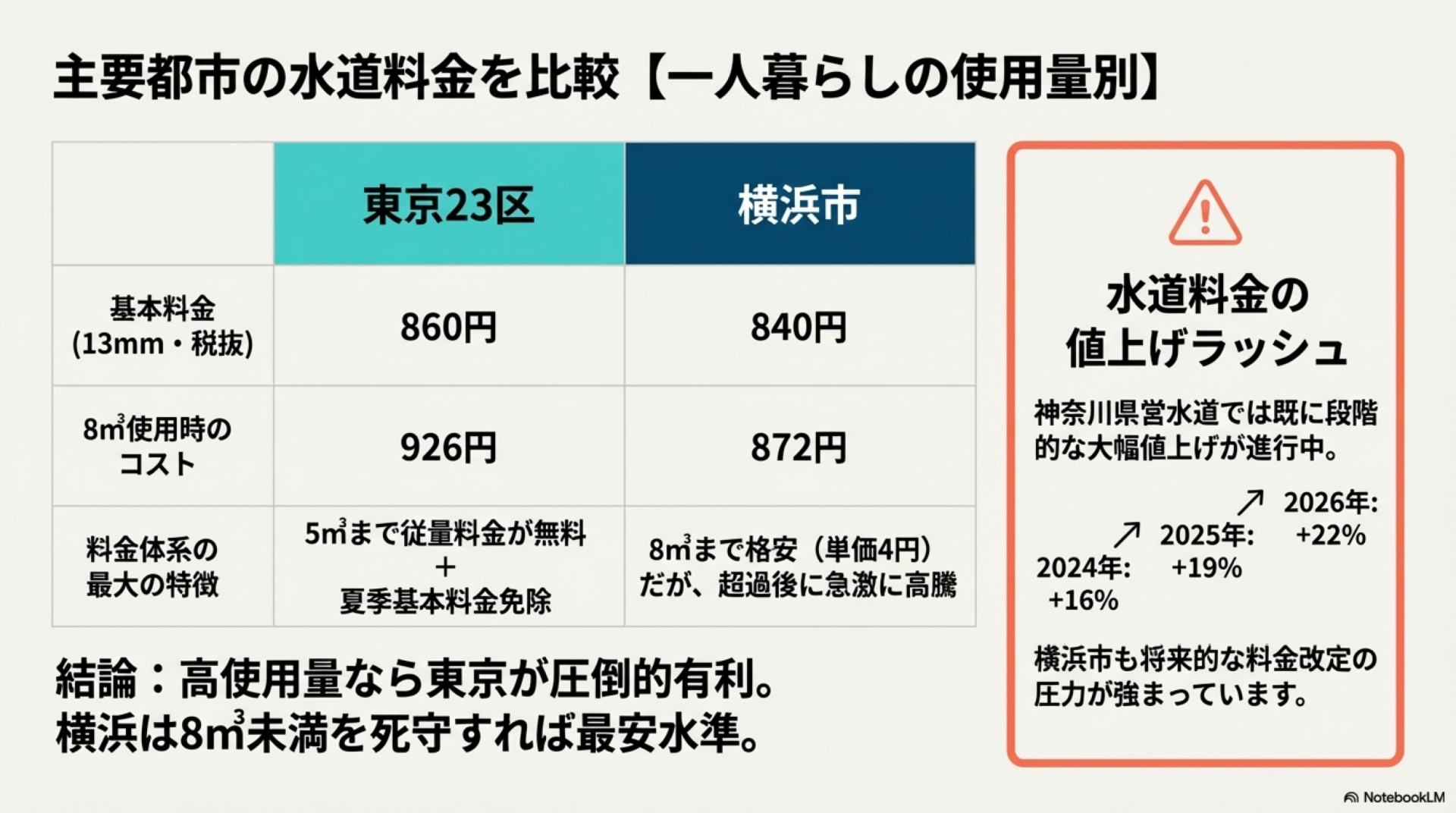 ⚠️ 注意点: 水道料金だけを比較すると8㎥使用時は東京23区と横浜市で大差がありません。しかし、下水道使用料を加えた「実際の支払額」や、使用量が増えた場合の料金上昇カーブは都市ごとに大きく異なります。