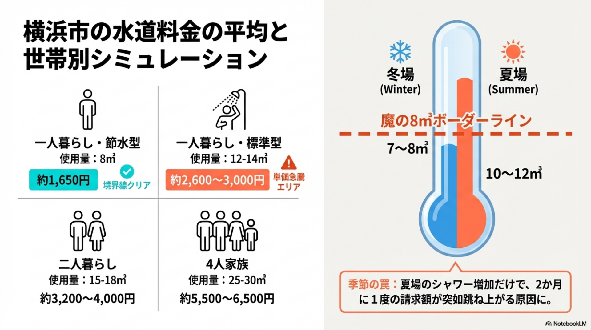 横浜市の料金体系では、8㎥を超えた瞬間に従量料金が急上昇するため、夏場に9〜10㎥を使うだけで冬場より月500〜1,000円程度高くなるケースがあります。