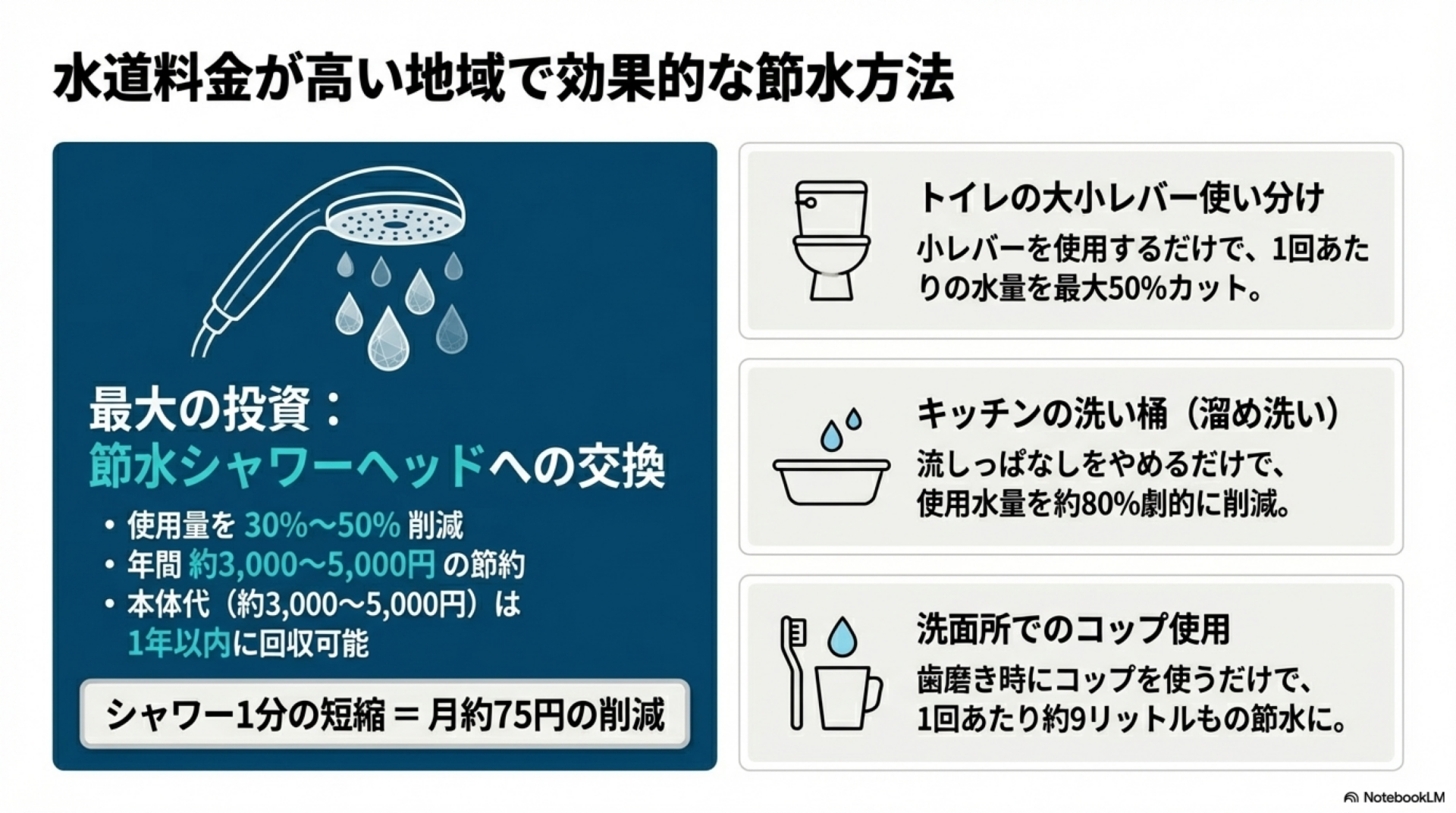 節水シャワーヘッドは30〜50%の節水効果があり、横浜市のような高額地域では年間3,000〜5,000円の削減が見込めます。初期投資3,000〜5,000円程度で1年以内に元が取れるため、最も費用対効果の高い節水対策です。