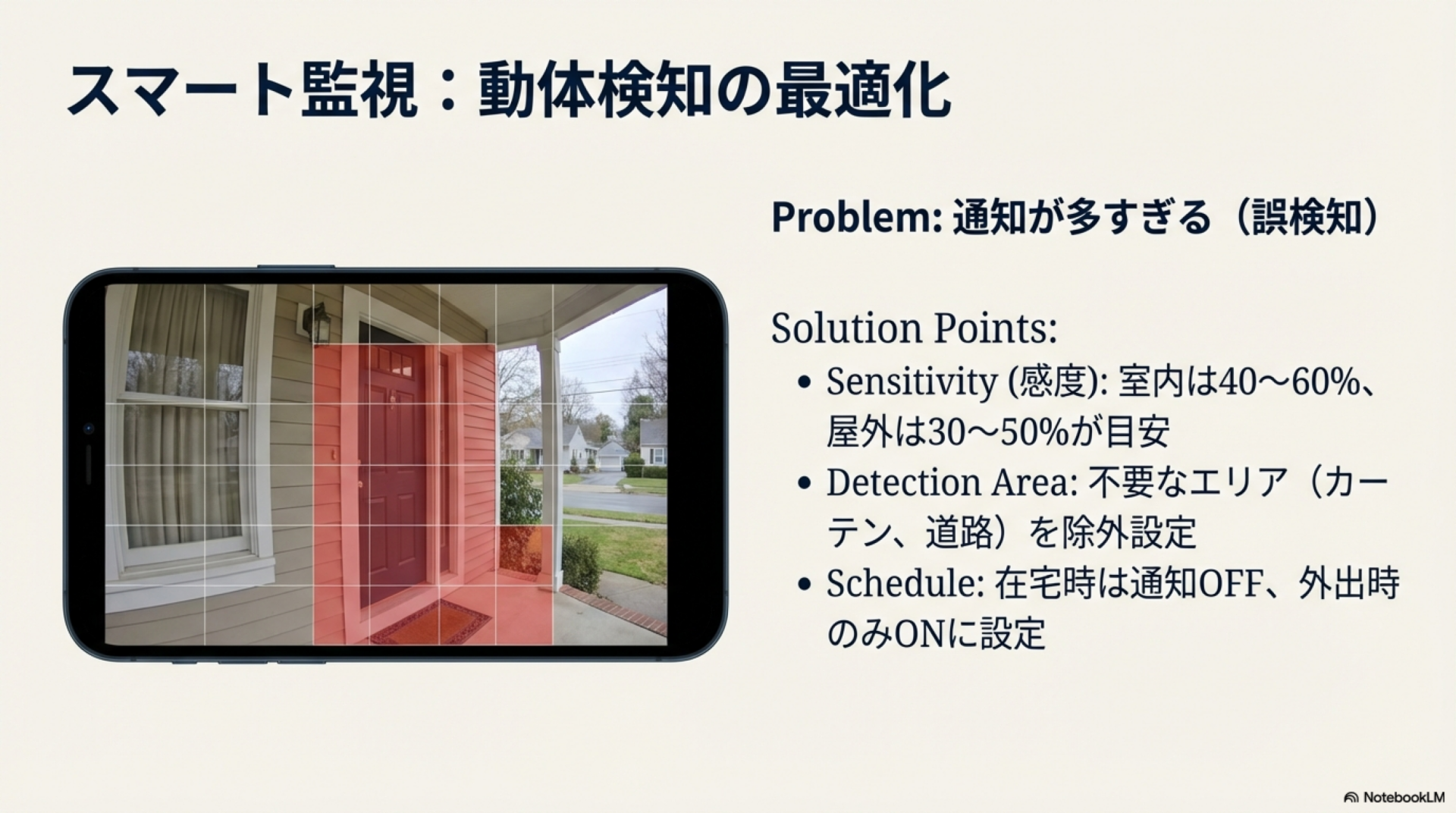 動体検知の感度を下げる(40〜50%程度)か、検知エリアを限定することで通知を減らせます。また、通知スケジュールを設定して外出時間のみ通知を受け取る設定も有効です。