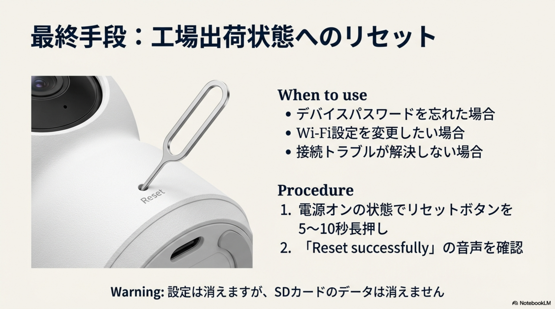 - カメラ背面のリセットボタンを5秒間長押し