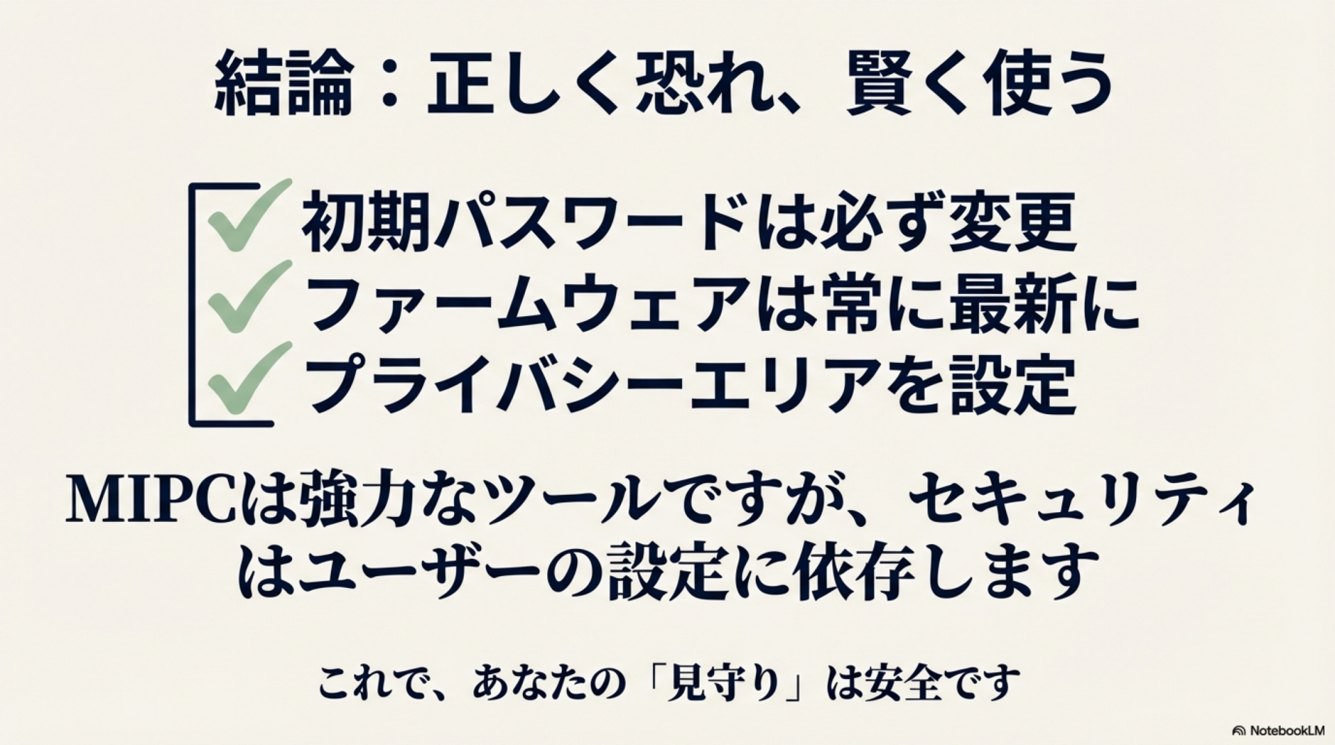 セキュリティリスクを理解した上で、適切な設定を行うことでMIPCカメラを安全に運用できます。