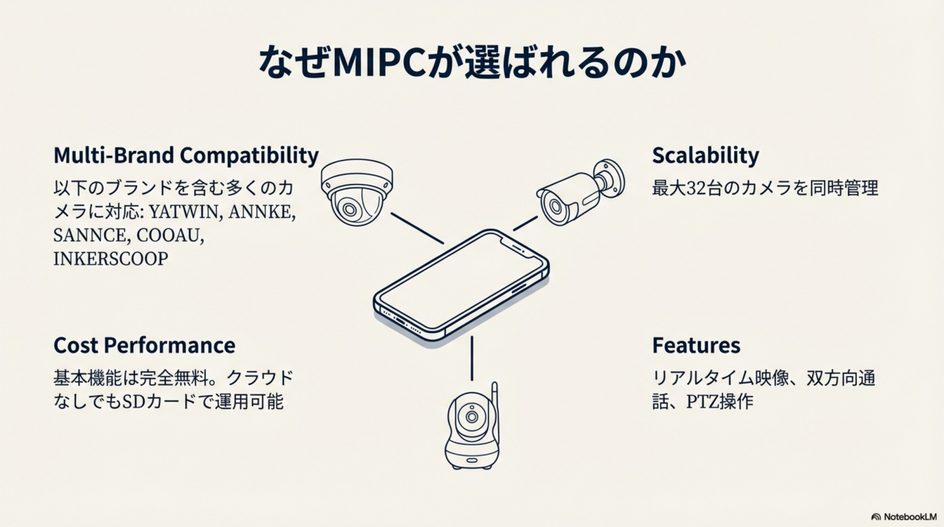 MIPCアプリは基本機能が無料で使え、最大32台のカメラを同時管理できる拡張性が特徴です。一方で、P2P通信によるセキュリティ上の懸念点もあるため、本記事ではリスクと対策の両面から解説します。
