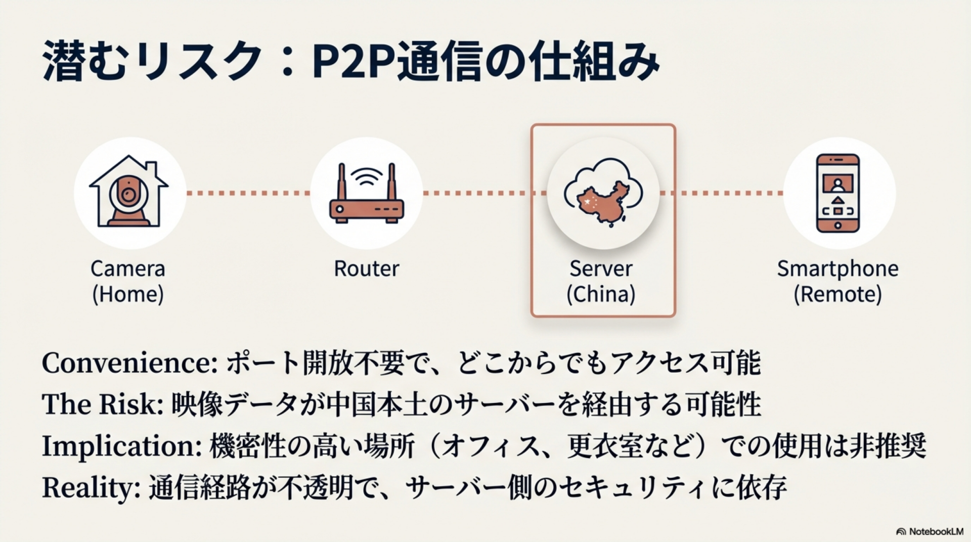 MIPCカメラはP2P(Peer-to-Peer)通信を使用してスマートフォンと接続します。この仕組みにより、ルーターのポート開放なしで外出先からカメラにアクセスできる利便性がある一方、中国本土のサーバーを経由する通信が発生します。