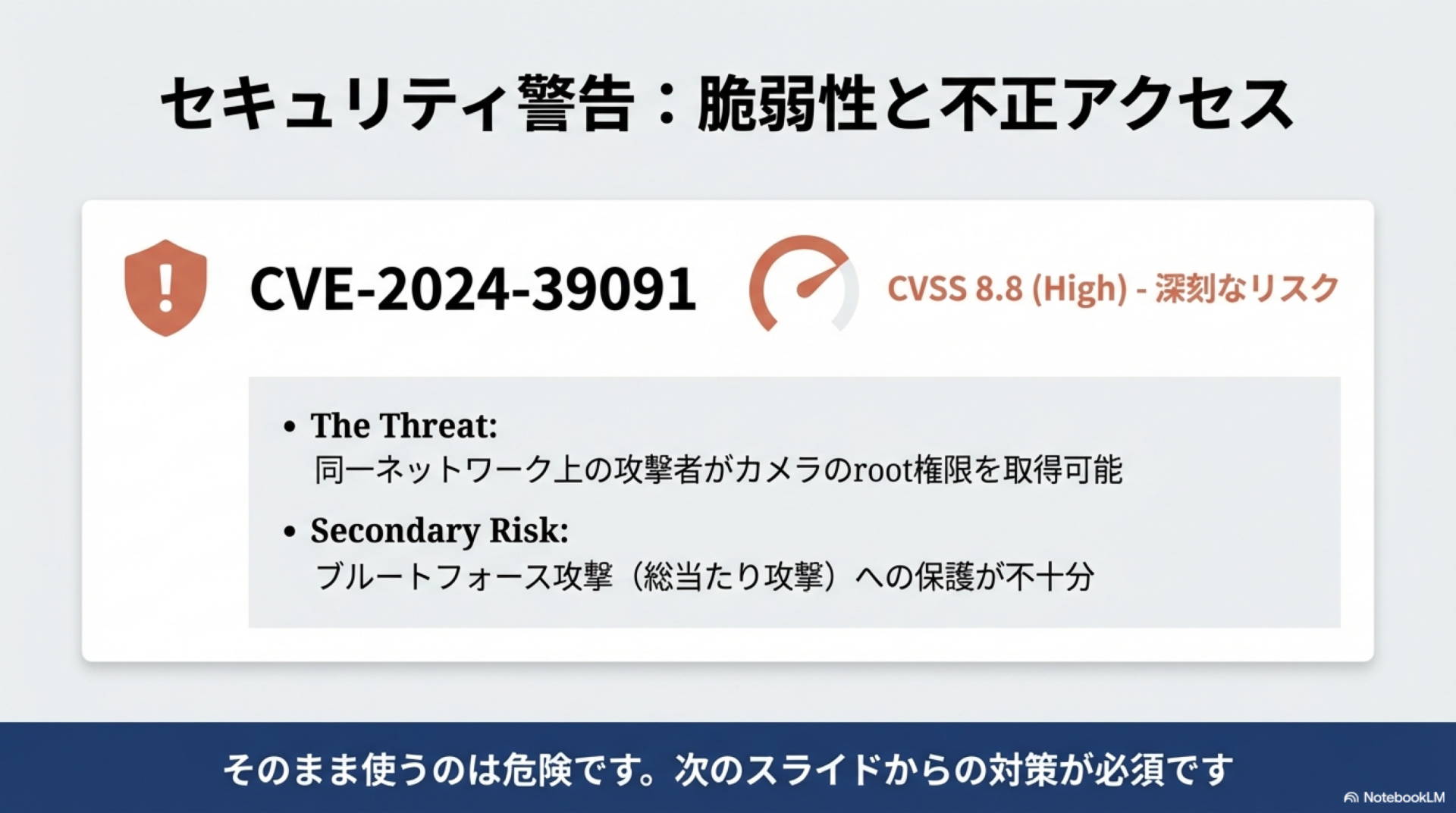 MIPCカメラシステムを使用する前に、潜在的なセキュリティリスクを理解しておくことが重要です。リスクを把握した上で適切な対策を講じることで、安全に利用できます。