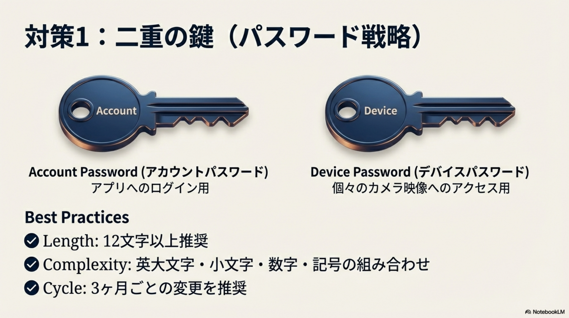 MIPCではアカウントパスワードとデバイスパスワードの2種類のパスワードを設定します。どちらも強固なものを設定してください。