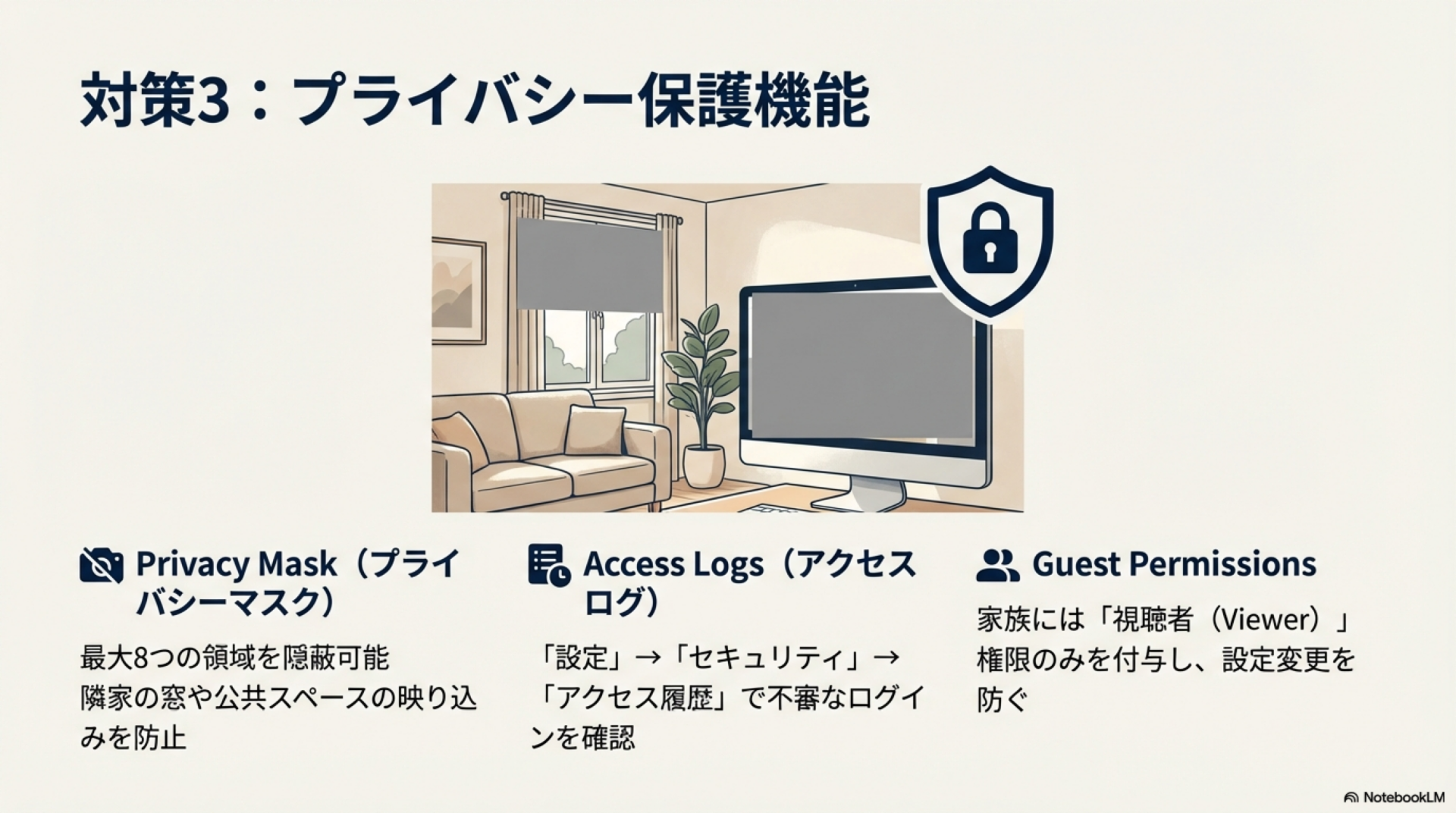 プライバシーモード: 特定の時間帯(在宅中など)にカメラを自動的にオフにする機能です。「設定」→「プライバシーモード」からスケジュールを設定できます。\